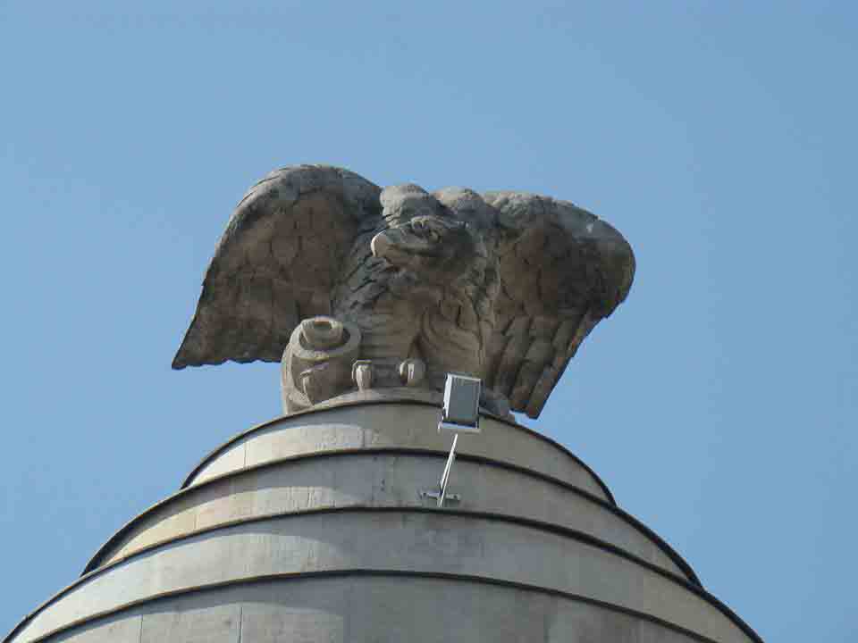 W górnej części fasady widać płaskorzeźby dłuta Zygmunta Otta, tematycznie związane z rolnictwem. Ryzality wieżowe zwieńczono cokołami, na których umieszczono bliźniacze orły również autorstwa tego rzeźbiarza. Od nich właśnie wywodzi się nieoficjalna nazwa gmachu.Przed wojną swoją siedzibę miało tu Towarzystwo Kredytowe Przemysłu Polskiego.