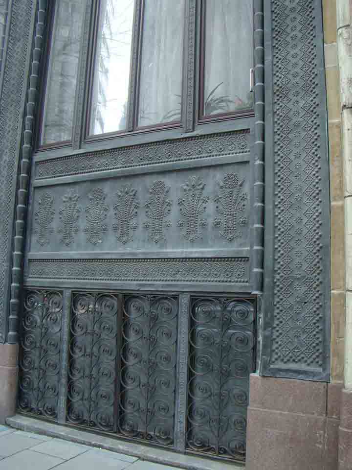 Ocalałe fragmenty miedzianej blachy na elewacji budynku.