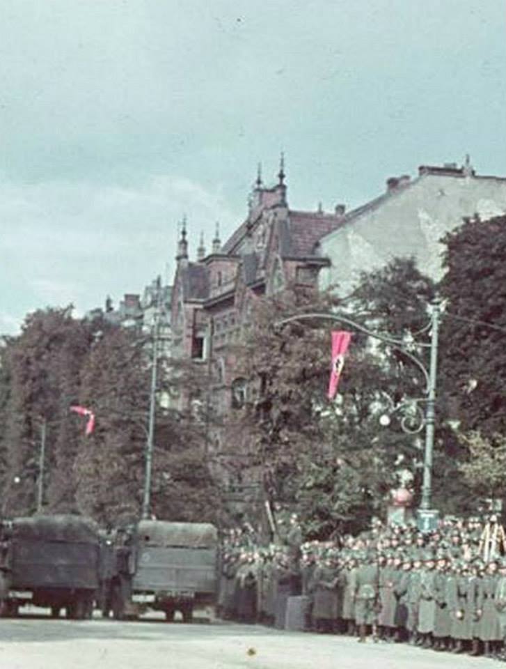 Adolf Hitler przyjmuje defiladę w dniu 5 października 1939. W głębi widoczna kamienica Taubenhausa.