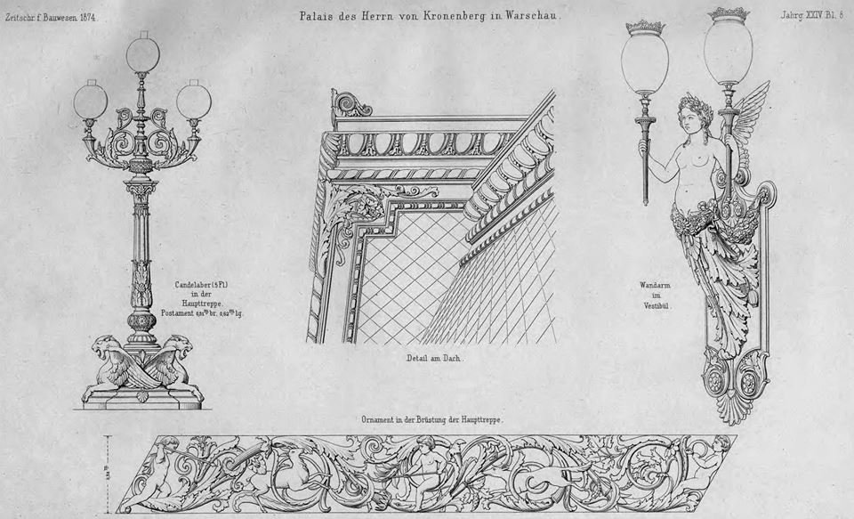Od lewej: kandelabry na szczycie balustrady klatki schodowej, detal dachu, kandelabry z holu wejściowego, fragment balustrady.