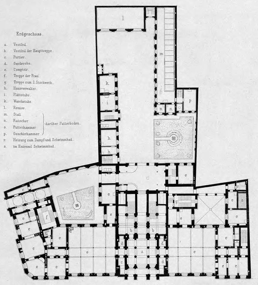 Główny wjazd do budynku znajdował się od strony ulicy Królewskiej. Powóz zatrzymywał się na pierwszym podwórku, gdzie wysiadała baronowa Ernestyna, skąd mogła skierować się do swoich apartamentów ulokowanych w lewej części budynku na I piętrze. Dalej powóz przejeżdżał do następnego środkowego podwórka, gdzie wysiadał baron i kierował się na prawo ku schodom połączonym z jego gabinetem i apartamentem na I piętrze, w prawej części budynku.