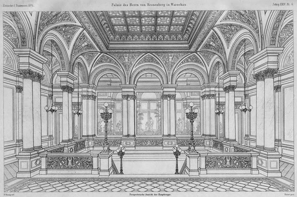 Widok na reprezentacyjną klatkę schodową – I piętro. Zarówno klatka schodowa jak i znajdujący się z tyłu Ogród Zimowy miały szklane zadaszenie (ten ostatni podwójne)