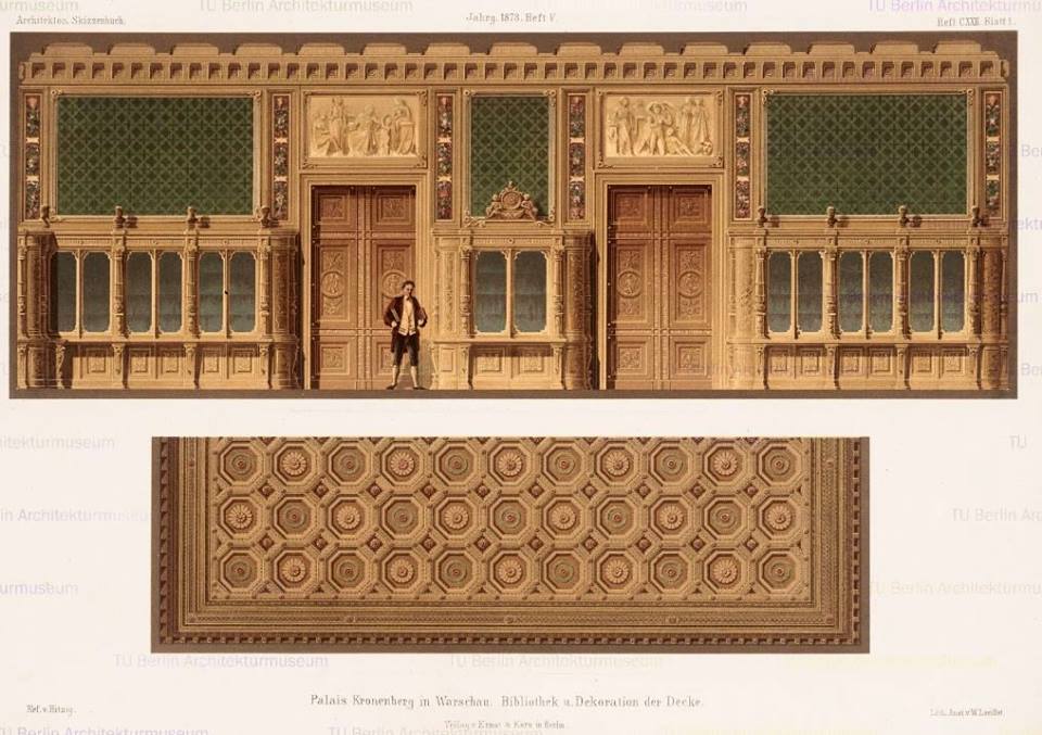 Widok stropu Salonu, znajdującego się na lewo od klatki schodowej na I piętrze. Na środku widoczny plafon z Apollem w rydwanie w otoczeniu muz