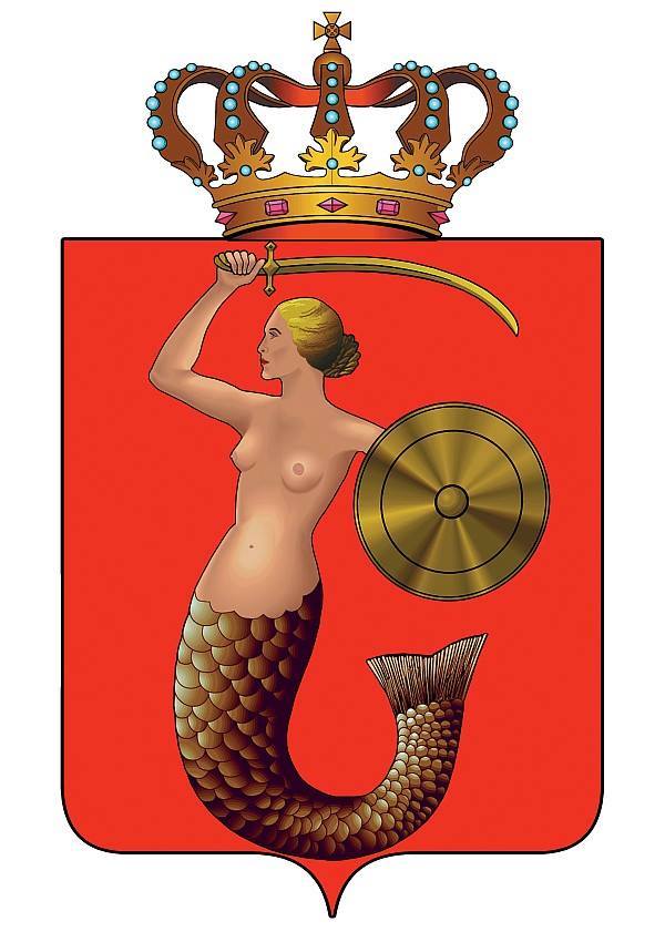 Herb przedstawia w polu czerwonej tarczy postać kobiety z rybim ogonem zwróconą w prawo, z wzniesionym mieczem w ręce prawej i tarczą okrągłą w ręce lewej. Barwy ciała i ogona rybiego naturalne, włosy złote, miecz i tarcza złote. Nad tarczą herbową znajduje się korona królewska.