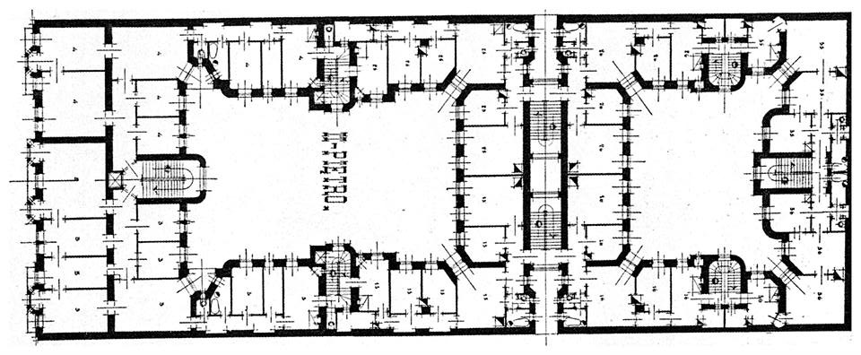 W sumie w budynku było 42 mieszkania od trzypokojowych (uważane za małe) do ośmiopokojowych w części frontowej, o wysokości od 3,7 do 4,1 (normą było różnicowanie wysokości mieszkań w zależności od ich standardu)