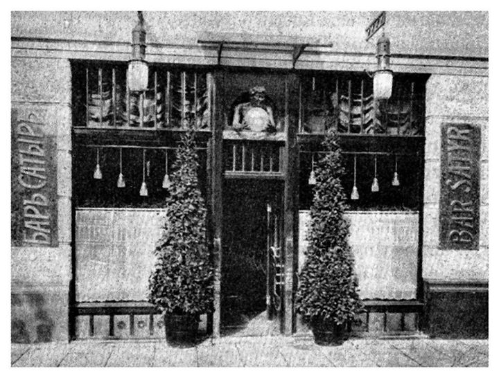 Wejście do baru ozdobiono figurą śmiejącego się satyra, trzymającego szklaną, świecącą kulę. Bar założony został przez Józefa Prostkę, a prowadził go Józef Brandys. Wnętrza urządzono w stylu secesyjnym.
