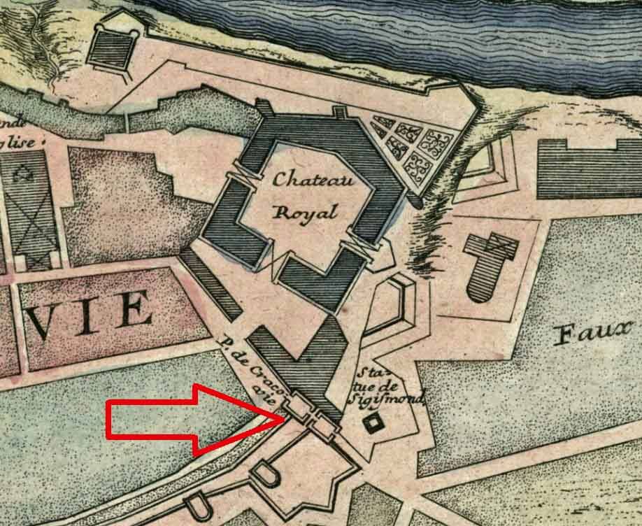 Brama Krakowska na planie Starej Warszawy z roku 1700.