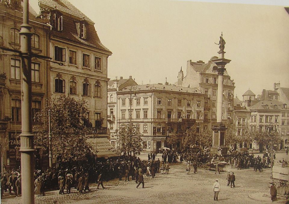 Plac Zamkowy na początku XX wieku. Pod brukiem znajdują się zapomniane fragmenty mostu gotyckiego, prowadzącego do Bramy Krakowskiej.