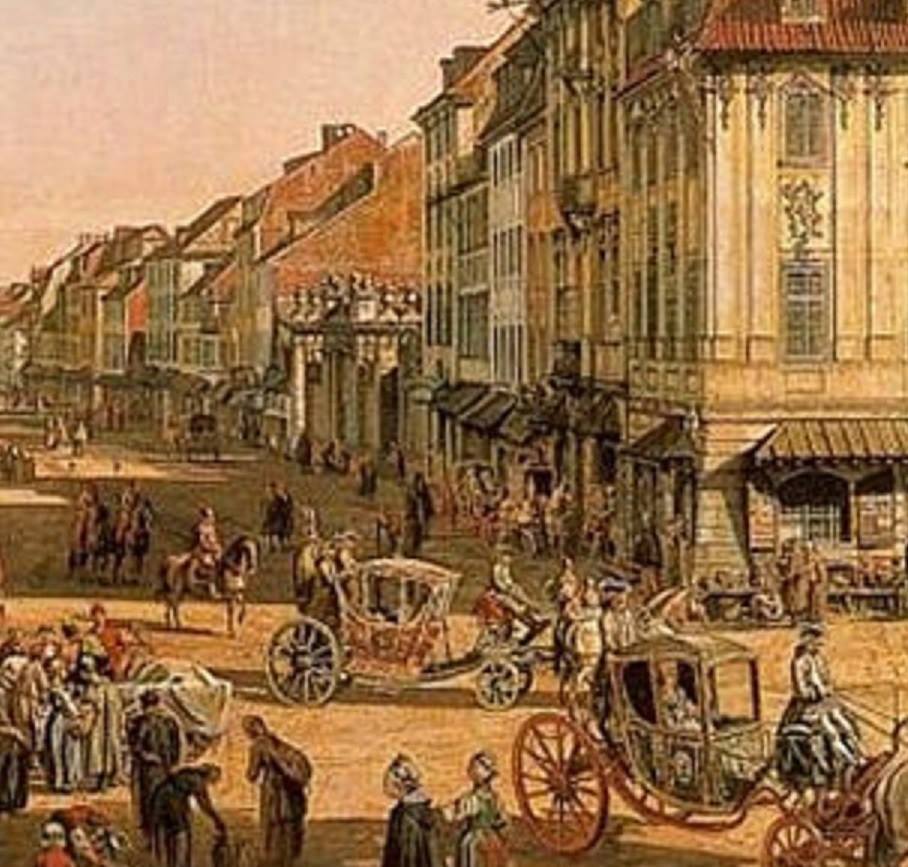 Ulica Miodowa jeszcze nie łączy się z Krakowskim Przedmieściem. Połączenie zostało przebite w latach 1886-1888.