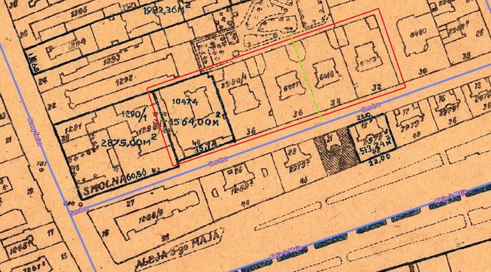 Plan Smolnej w okolicach Nowego Światu w roku 1936. Na zaznaczonym fragmencie widoczne cztery kamienice czynszowe i kamienica Branickich pod numerem 40. Zieloną linią zaznaczono płaszczyznę symetrii kamienic Smolna 32 i 34 oraz 36 i 38