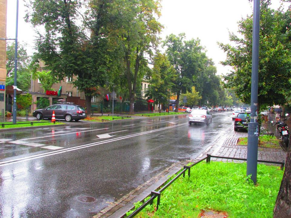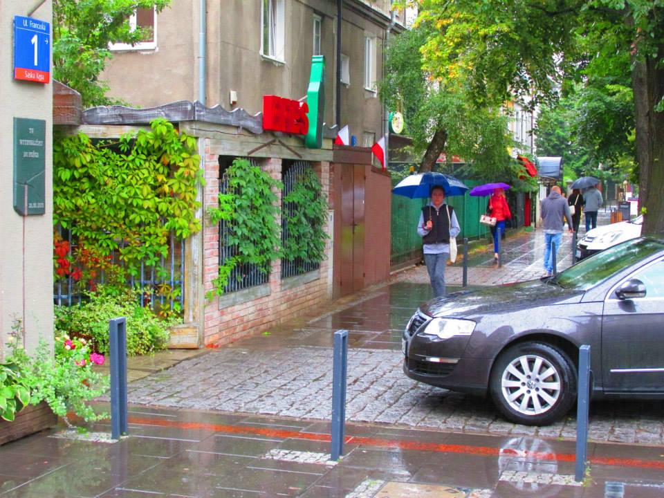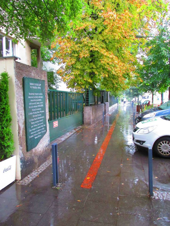 Miejsce w którym przebiegała barykada oznaczono na chodniku.4Tablica po drugiej stronie ulicy.
