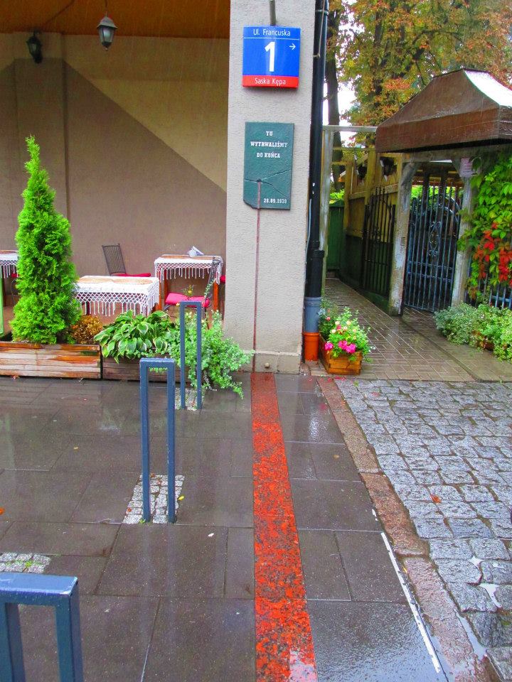 Miejsce w którym przebiegała barykada oznaczono na chodniku.