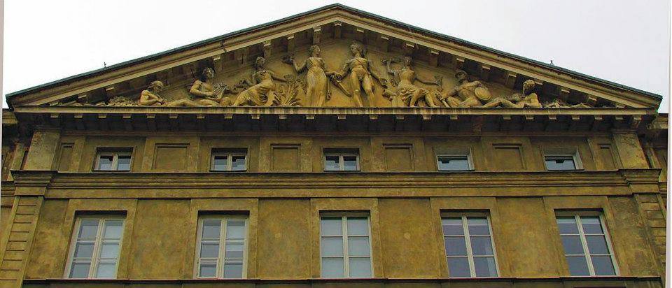 Pałac Kazimierzowski – alegoria Nauki i Sztuki w tympanonie.
