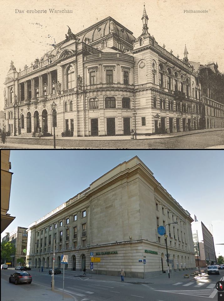 Porównanie wyglądu gmachu na pocztówce i w Google Maps.