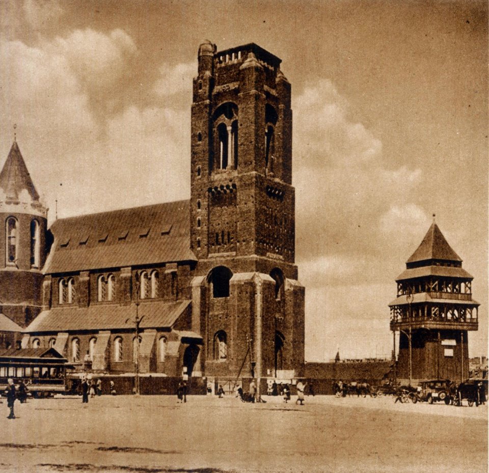 Przy kościele widoczna drewniana dzwonnica, w której wisiały dzwony przeznaczone do umieszczenia w planowanej Świątyni Opatrzności Bożej.