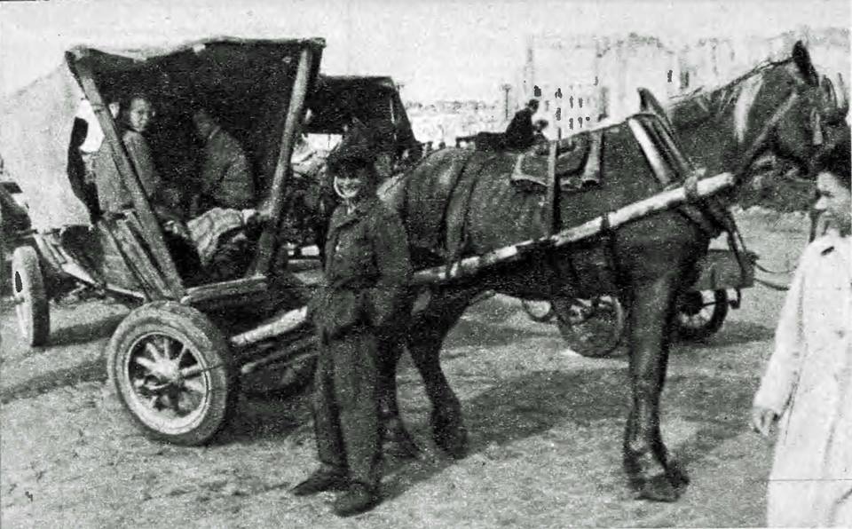 Tę furmankę właściciel zaadaptował do przewozu osób poprzez dodanie prowizorycznego daszku. W czasie deszczu na głowę już nie kapało.