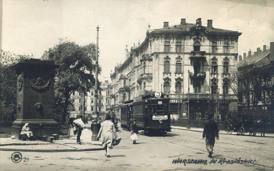 Plac Krasińskich. Próby przed otwarciem pierwszej linii tramwaju elektrycznego. Marzec 1908 roku