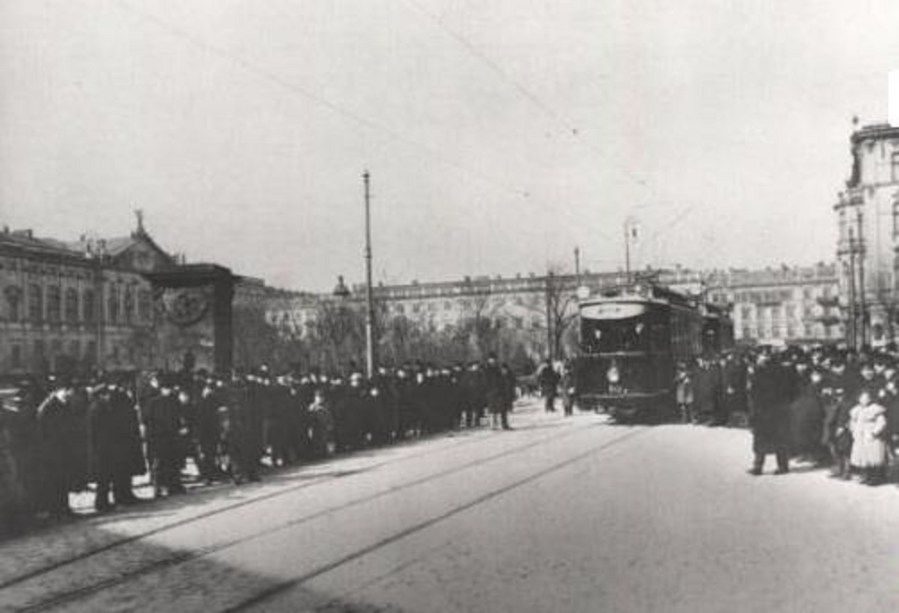 Plac Krasińskich. Próby przed otwarciem pierwszej linii tramwaju elektrycznego. Marzec 1908 roku.