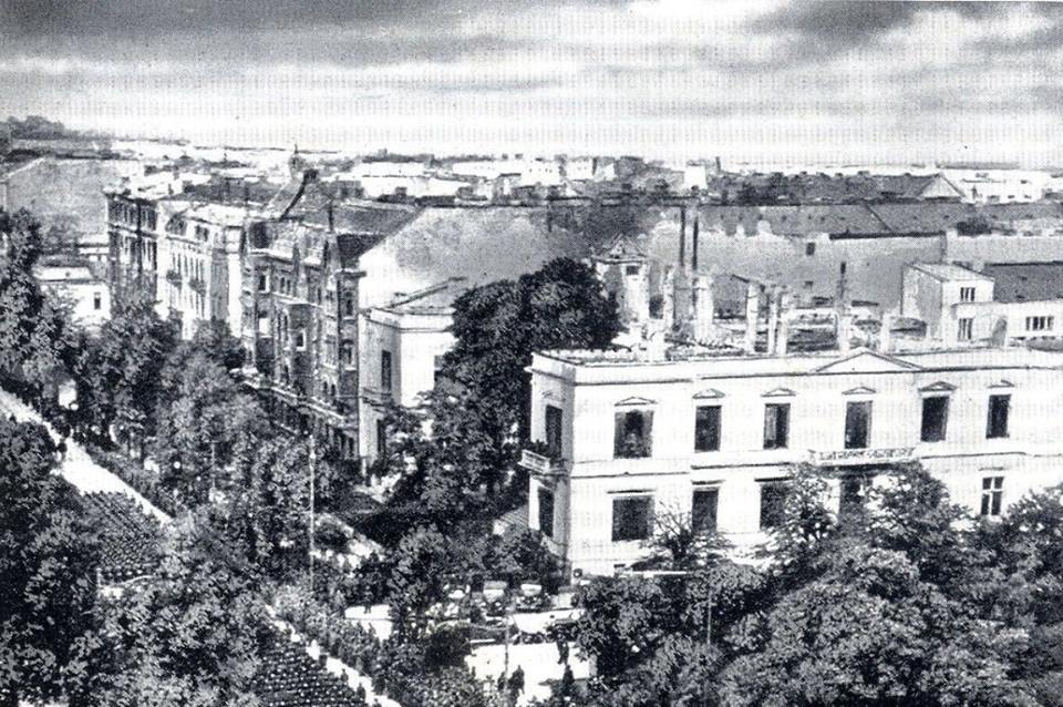 5 października 1939 roku, w Alejach Ujazdowskich, Adolf Hitler odebrał defiladę zwycięskiej armii niemieckiej. Jest wiele zdjęć z tej, dla Polaków smutnej, ceremonii. Prezentowana fotografia jest szczególnie interesująca, gdyż została wykonane z góry, najprawdopodobniej z okna nieistniejącej dziś kamienicy Spokornego. Dzięki temu, że fotograf znalazł się wysoko, widać doskonale pałacyk Rembielińskiego przy ulicy Piusa XI (obecnie nosi nazwę Piękna) i stojącą za nim kamienicę Taubenhausa. Wypalone mury kamienicy zostały rozebrane po wojnie. Dalej widoczne kamienice również wojny nie przetrwały. Podczas spacerów Alejami Ujazdowskimi, pokazujemy naszym Gościom miejsce, z którego Hitler przyjmował defiladę