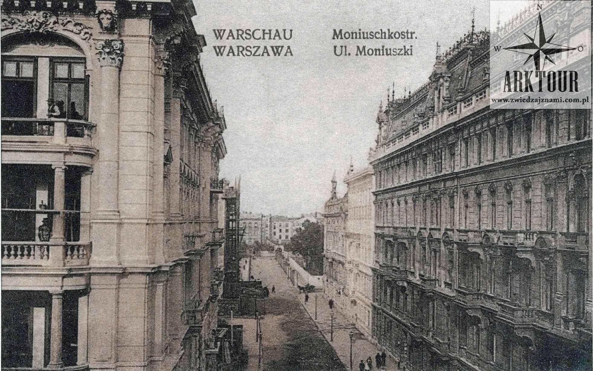 Trzeci budynek w głębi ulicy Moniuszki po prawej, czyli po nieparzystej stronie ulicy Moniuszki, to gmach Filharmonii Warszawskiej.