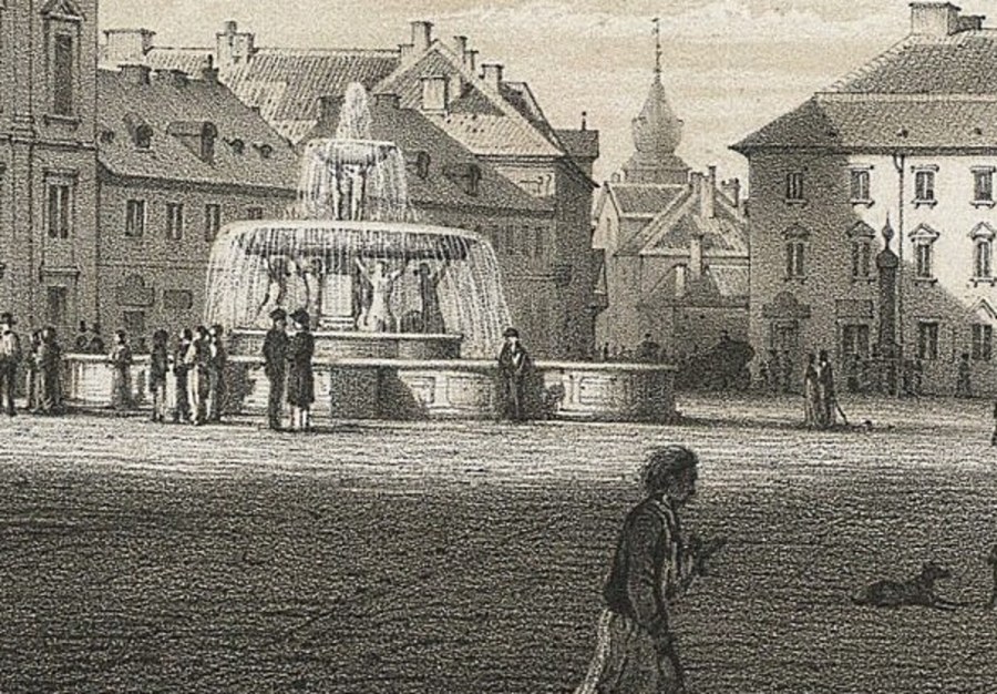 Fontanna na placu Teatralnym według projektu Augusta Kissa. Były to cztery Syreny trzymające w rękach uniesionych do góry paterę z trzema postaciami chłopięcymi dzierżącymi na głowach mniejszą paterę. Z tej mniejszej tryskała woda. Tę fontannę rozebrano w roku 1898. Źródło CBN Polona