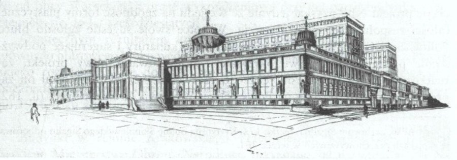 Jeden z projektów siedziby NBP. Obraz w zbiorach MNW.
