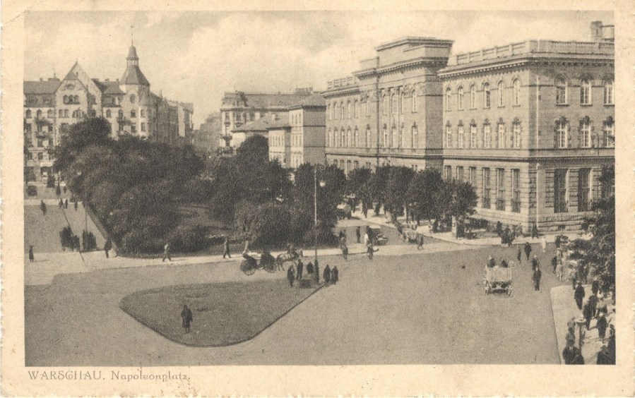 W roku 1921 plac Warecki przestał być placem Wareckim. W setną rocznicę śmierci Napoleona Bonaparte zmieniono nazwę na plac Napoleona i w tym samym roku usunięto rzeźbę ze szczytu gmachu. Polakom przypominała o latach zaborów, Korsykaninowi – o wyprawie moskiewskiej. Po odzyskaniu niepodległości w roku 1918 budynek stał się siedzibą powołanego w roku 1919 Ministerstwa Poczt i Telegrafów. Ministerstwo mieściło się w nim do roku 1939. Pocztówka ze zbiorów własnych.