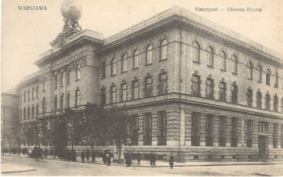 Gmach Poczty Głównej. Grupa rzeźbiarska atlantów z kulą ziemską na plecach jako zwieńczenie szczytu fasady budynku była popularnym motywem na terenie Imperium Rosyjskiego. Muskularni giganci z globem na grzbietach pojawiali się na kamienicach czynszowych i gmachach urzędowych. Można ich było zobaczyć choćby na gmachach pocztowych w Moskwie i Sankt – Petersburgu. Gdy w roku 1912 rozpoczęto budowę nowego gmachu Poczty Głównej na placu Wareckim, tuż przy wylocie ulicy Wareckiej, architekt Antoni Jabłoński – Jasieńczyk przewidział właśnie takie nawiązanie do imperialnych gmachów pocztowych. Pocztówka ze zbiorów własnych.
