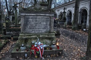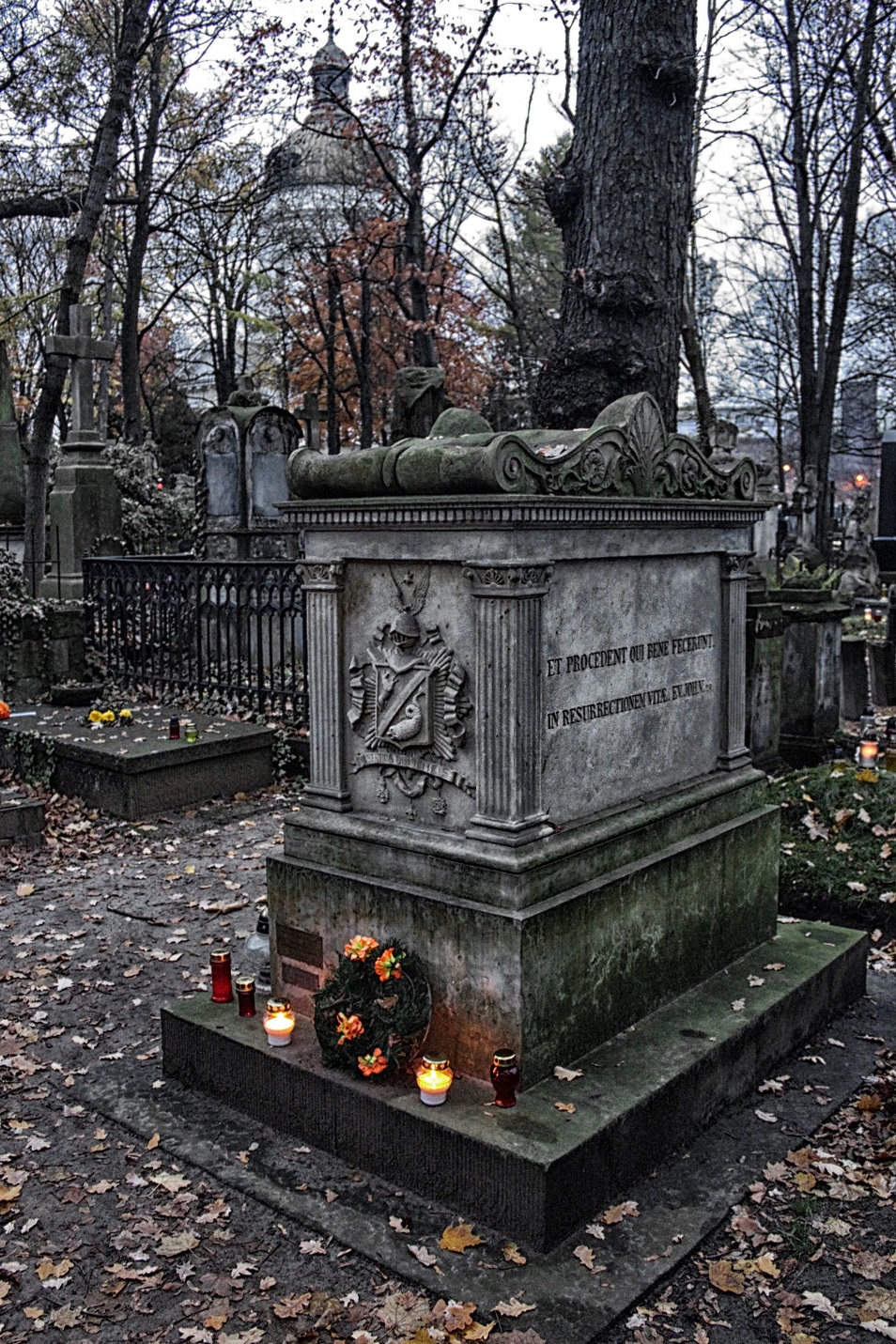 Wiele jest takich nagrobków na na powązkowskim cmentarzu i mało kto zwraca na niego uwagę, a jeśli już, to bardziej uwagę przykuwa herb z jednorożcem i delfinem na tarczy niż nazwisko zmarłego.