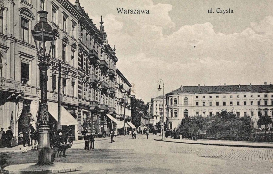 Ulica Czysta czyli obecna Ossolińskich. Na miejscu kamienic po lewej stronie stoi dzisiaj biurowiec Metropolitan. W głębi zdjęcia widoczny hotel Europejski.