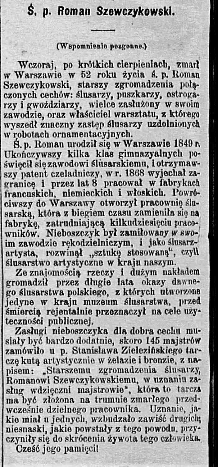 W uznaniu dla kunsztu wyrobów Roman Szewczykowski zyskuje przydomek „Żelaznego Kwiaciarza”, a w roku 1898 staje na czele Cechu Ślusarzy, Puszkarzy, Ostrogarzy i Gwoździarzy.