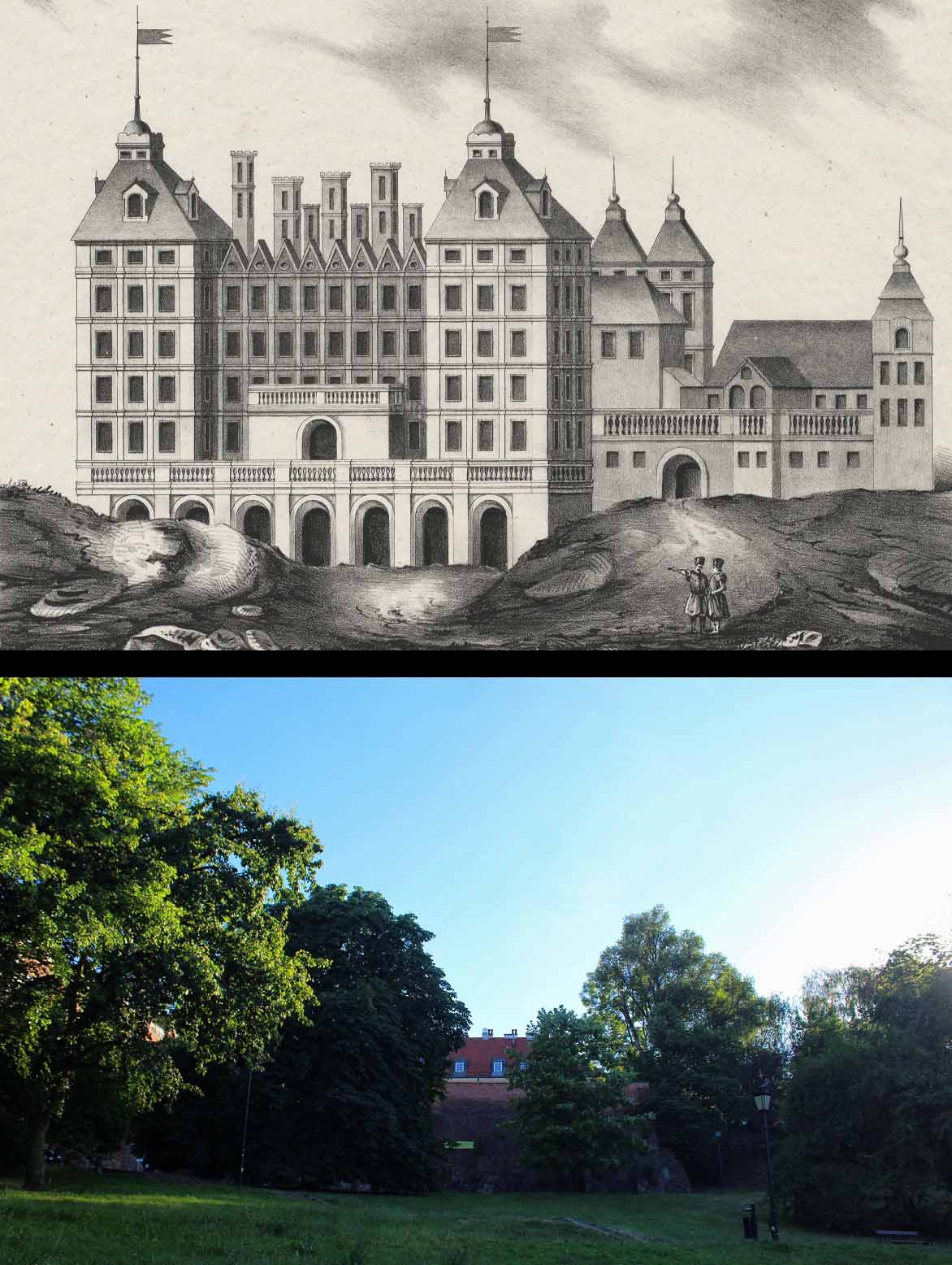 Skąd małpy w tym miejscu? Powyżej wznosił się jeden z najpiękniejszych pałaców Warszawy w czasie Potopu należący formalnie w czasie „Potopu” należący do Hieronima Radziejowskiego.
