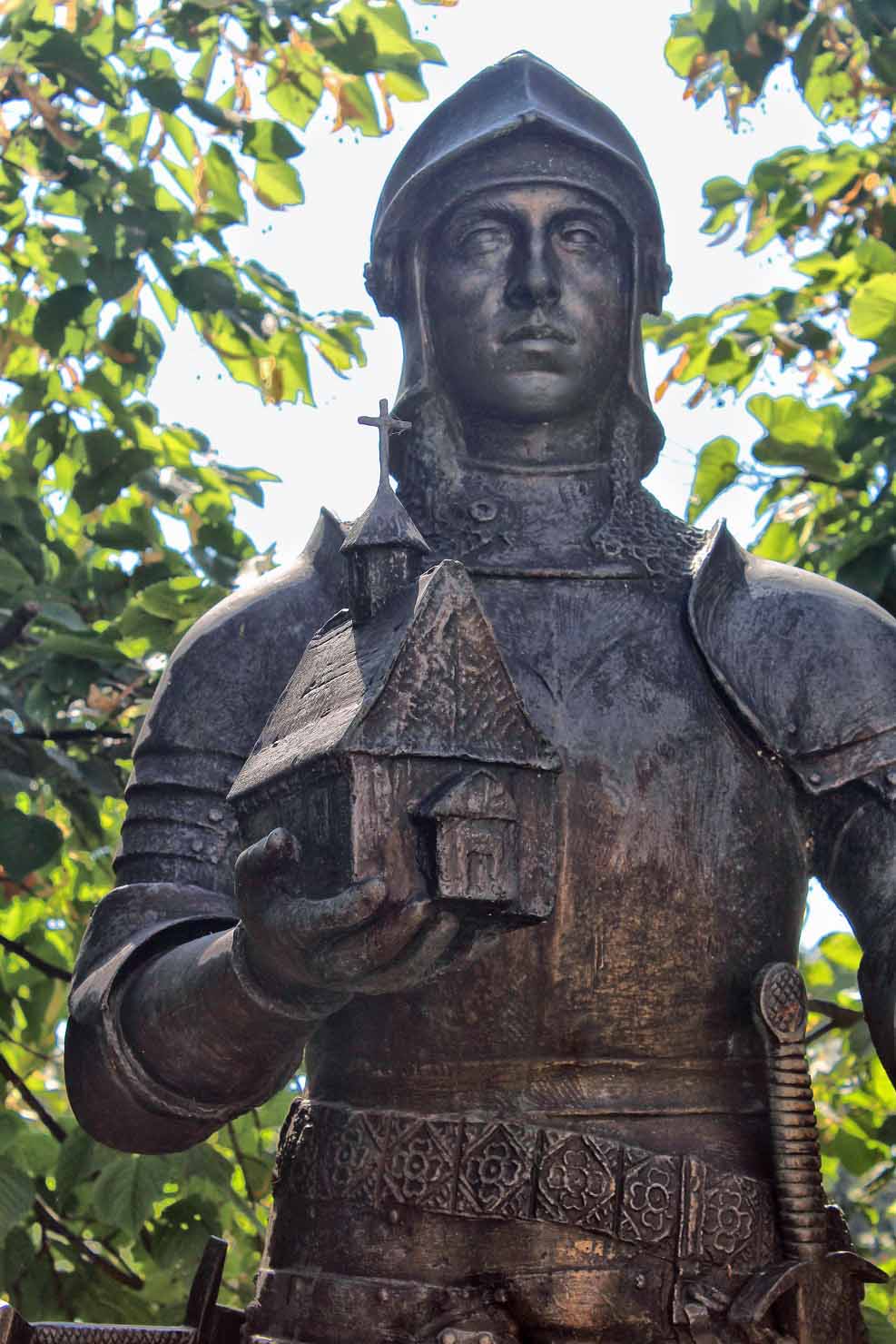 Rycerz trzyma w ręku miniaturę powsińskiej świątyni a wspiera się o tarczę z rodowym herbem Ciołek.