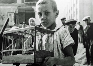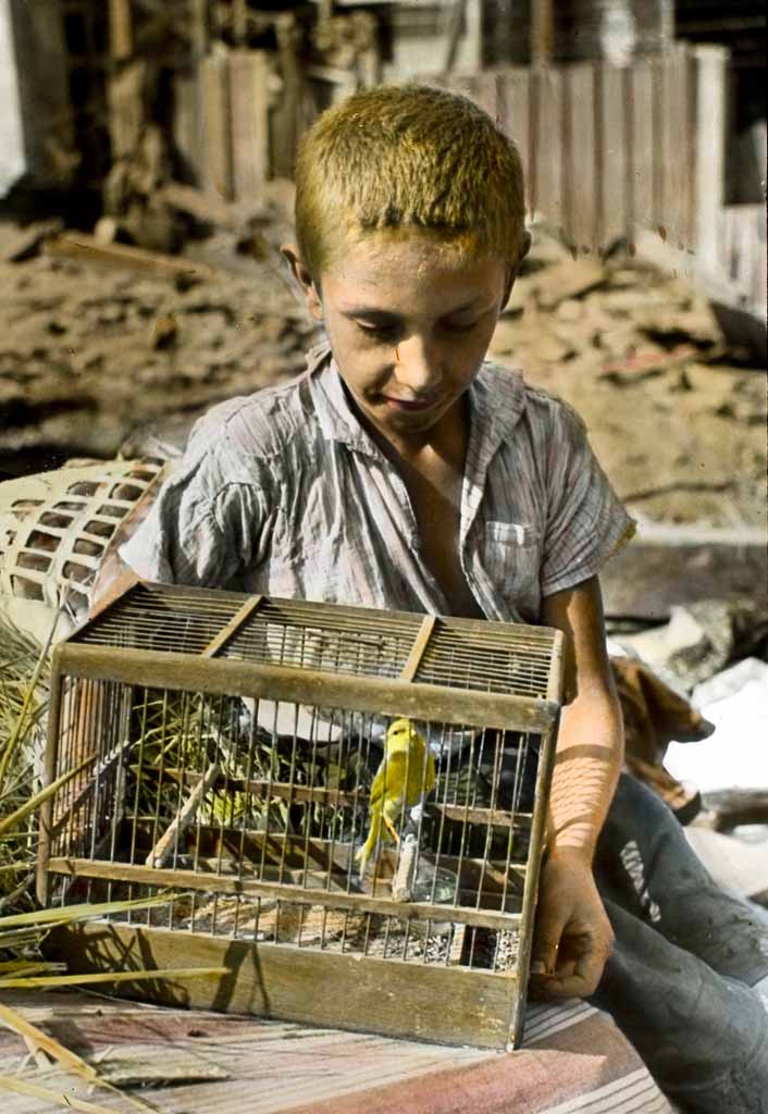 Współcześnie pokolorowana fotografia przedstawia dziewięcioletniego chłopca siedzącego na gruzach domu z zamkniętym w klatce kanarkiem.