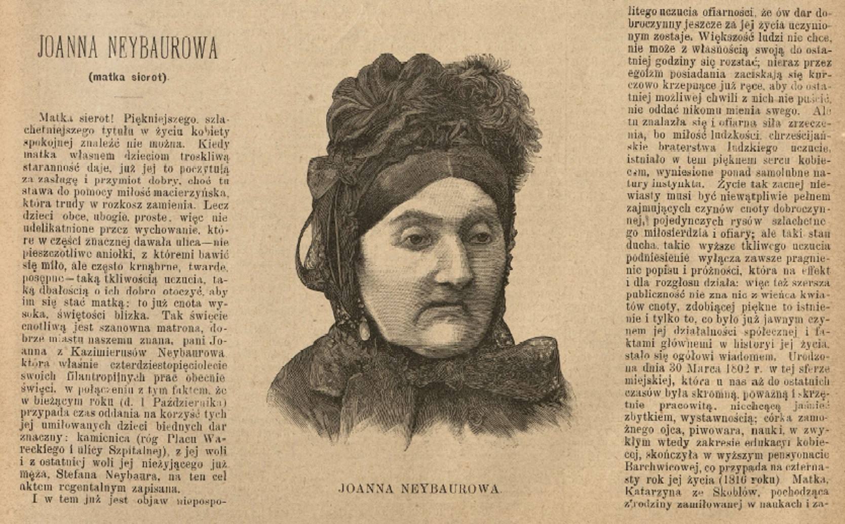 W pierwszej połowie roku 1885 w prasie Warszawskiej ukazują się liczne artykuły poświęcone Joannie Neybaur a przypominające o czterdziestej piątej rocznicy jej działalności charytatywnej.