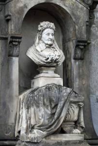 Wchodząc na Cmentarz Ewangelicko Augsburski trudno nie poczuć na plecach spojrzenia kobiety, której popiersie umieszczono w niszy okazałego grobowca rodziny Kazimirusów.