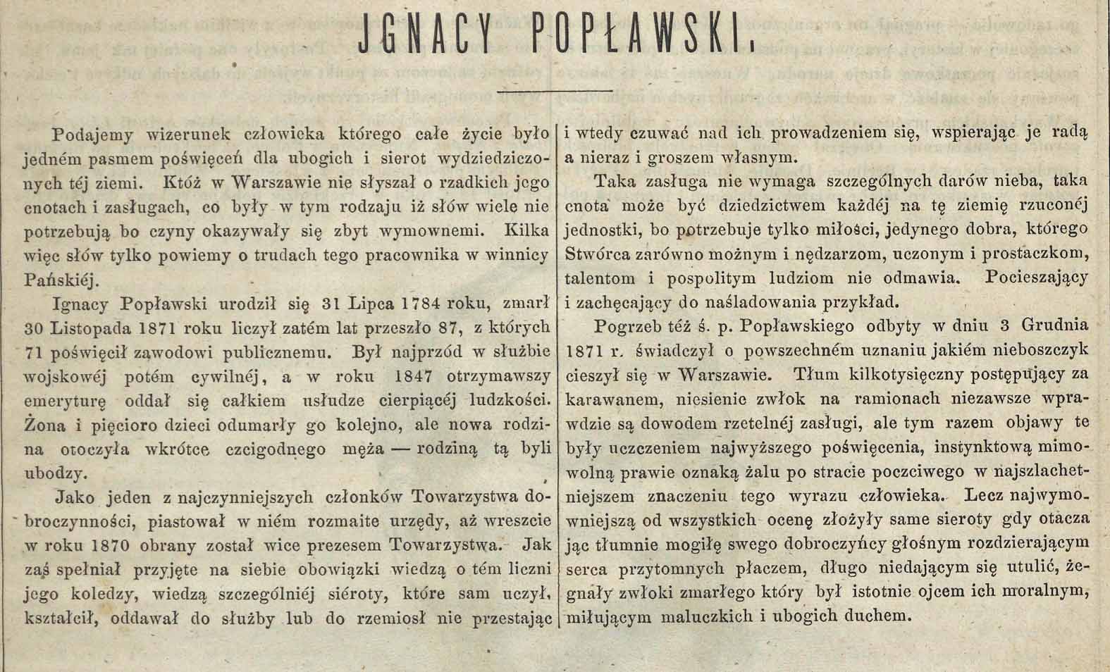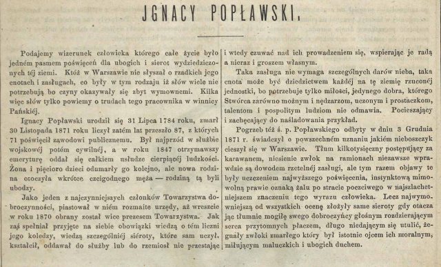 Natychmiast po przejściu w stan spoczynku Ignacy Popławski podejmuje działalność w Warszawskim Towarzystwie Dobroczynności. Był członkiem wielu komisji ale wielką sławę, popularność i sympatię przyniosła mu działalność w charakterze opiekuna domu sierot prowadzonego przez Towarzystwo.