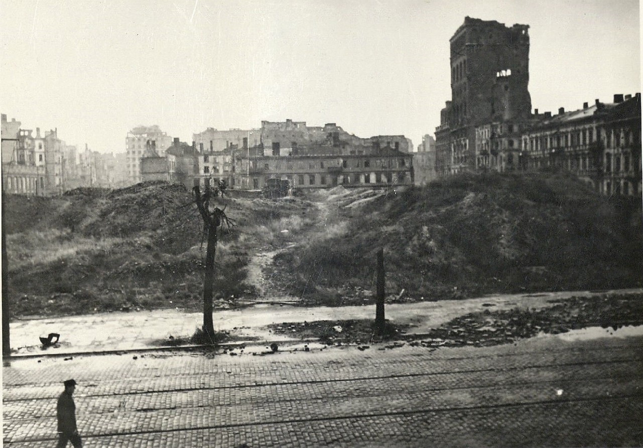 Spojrzenie z ulicy Królewskiej na gmach Polskiej Akcyjnej Spółki Telefonicznej. Pomiędzy ulicamy Zielną a Marszałkowską znajdują się wyłącznie zwały gruzów.