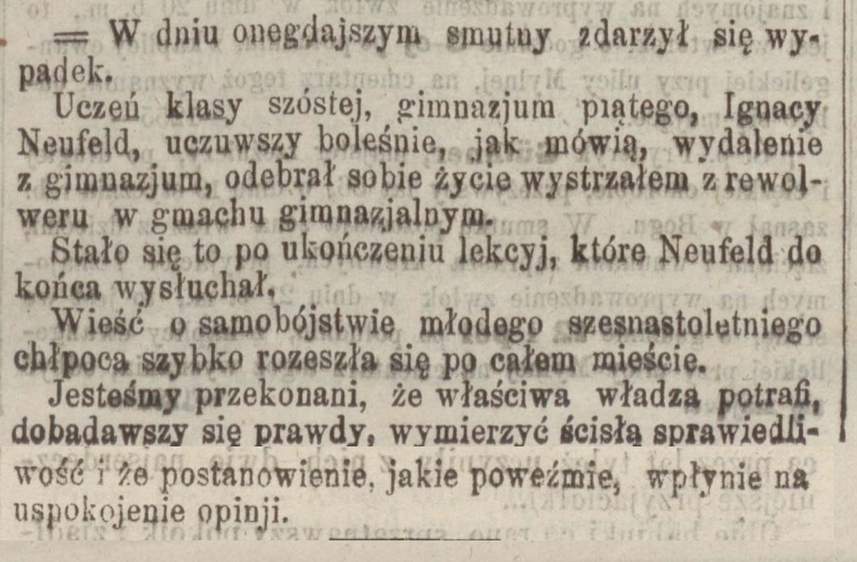 Przyczyn, które spowodowały wydalenie Neufelda z gimnazjum, nie chcemy tu dotykać, dopóki cala ta sprawa, w wysokim stopniu, przejmująca umysły ogółu, na drodze urzędowej dokładnie wyjaśnioną nie zostanie.
