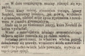 W murach szkolnych, w przybytku pracy i doskonalenia duchowych sił ludzkiej istoty, rozległ się wystrzał. Szesnastoletni uczeń klassy VI, gimnazyum V, Ignacy Neufeld odebrał sobie życie w obrębie klassy, po wysłuchaniu lekcyi.