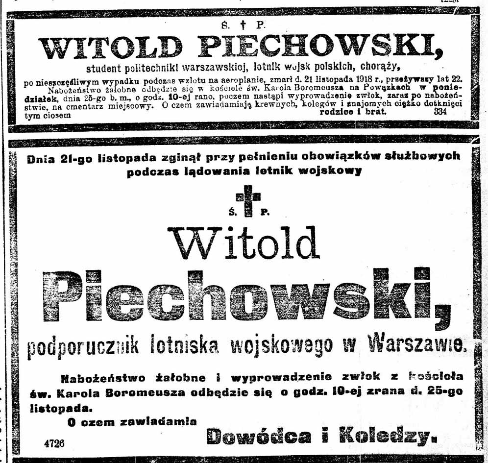 Nekrolog. Podporucznik pilot Witold Piechowski. Kurier Warszawski. 23 listopada 1918.