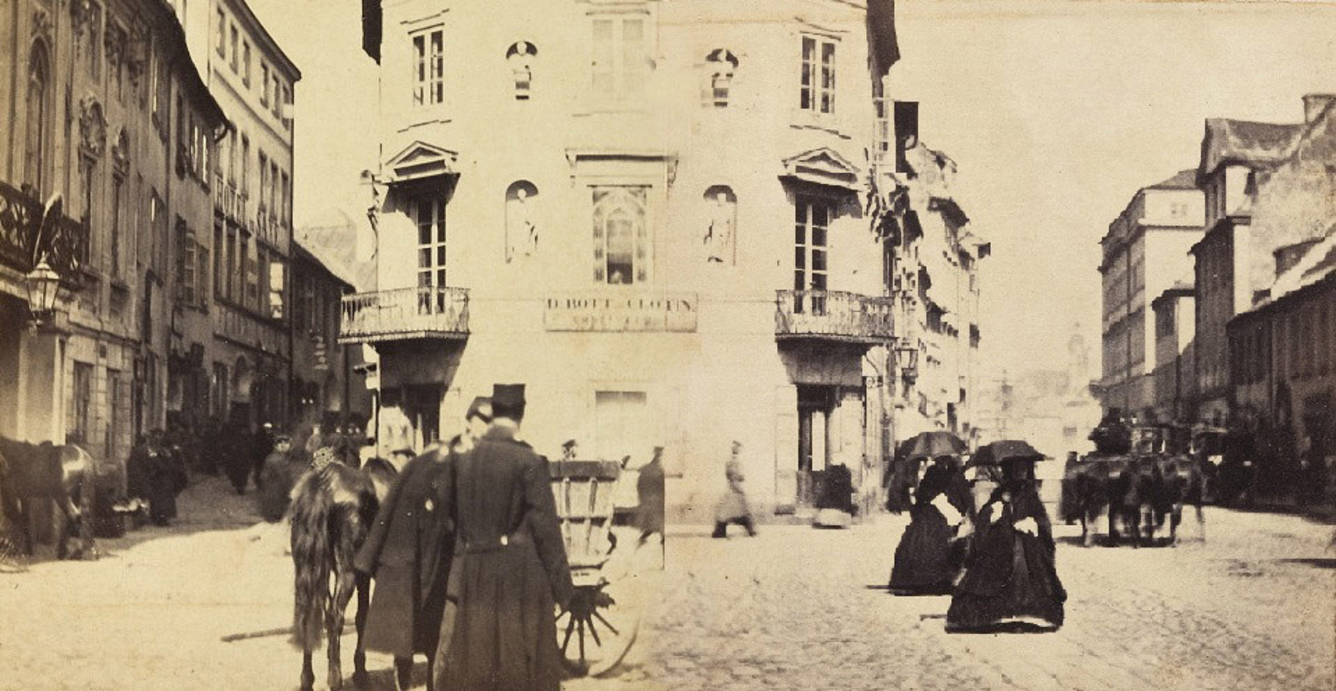 Na wprost widoczna, wzniesiona w roku 1837, kamienica Kestnerów. W tym miejscu, od roku 1837, można napić się kawy. Pierwszą kawiarnię, zaraz po ukończeniu budowy, otworzył Wawrzyniec Tosio. Na zdjęciu kawiarnia znajduje się już w rękach panów Botta i Clotina, co znajduje odzwierciedlenie na szyldzie. Mimo zmian właścicieli, pod takim szyldem lokal dotrwał do II wojny światowej, a po wojnie i odbudowie kamienicy odrodził się jako „Telimena”.