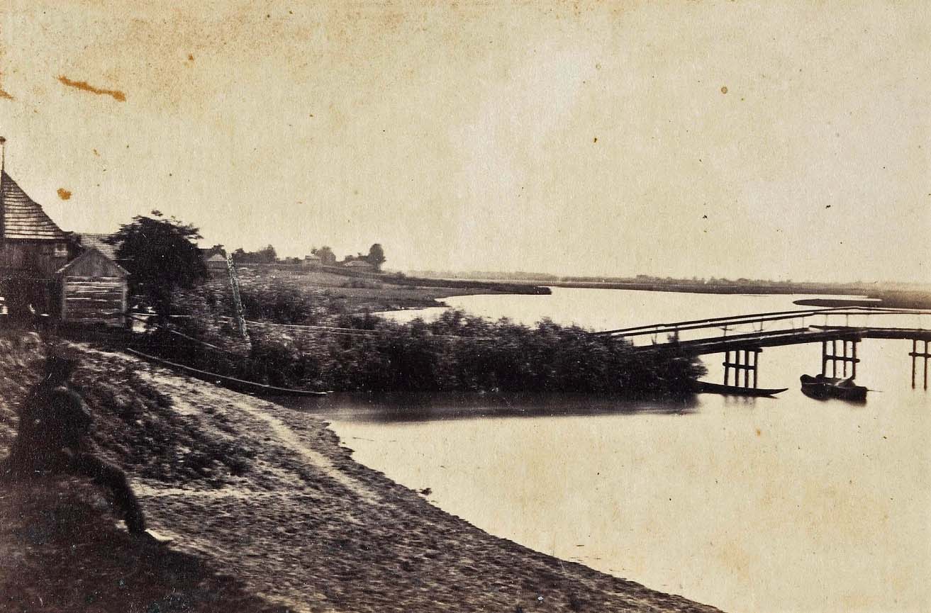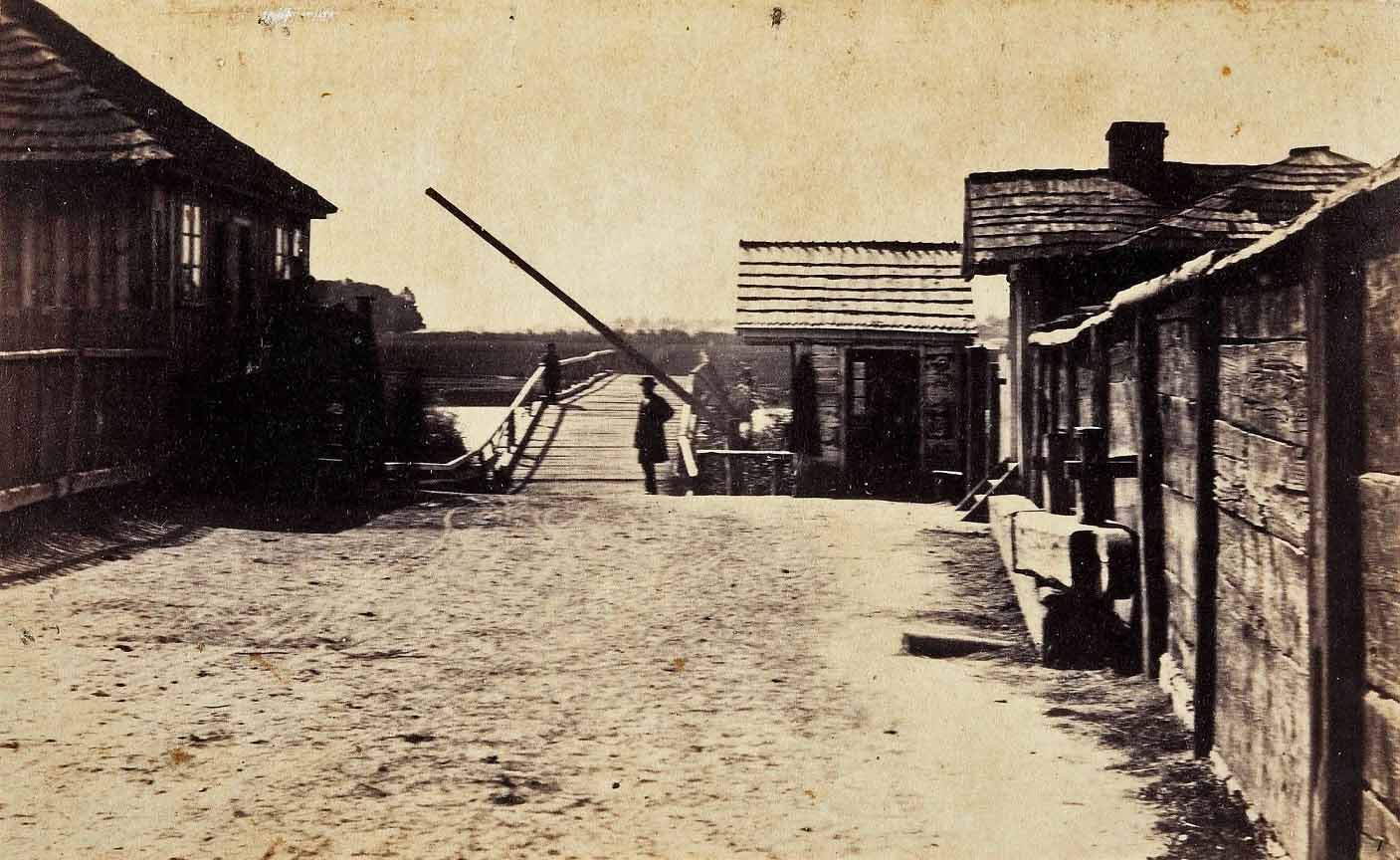 Na zdjęciu Karola Beyera z lat sześćdziesiątych XIX wieku rogatka na moście prowadzącym na Saską Kępę. Zdjęcie wykonano od strony Pragi.