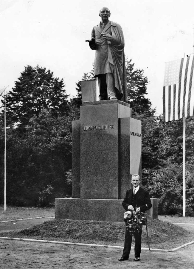 Autor pomnika, Franciszek Black, przed swoim dziełem. Uroczystość odsłonięcia pomnika pułkownika Edwarda Mandella House’a w parku Skaryszewskim imienia Ignacego Jana Paderewskiego. 4 lipca 1932 roku. Zdjęcie w zbiorach Narodowego Archiwum Państwowego.
