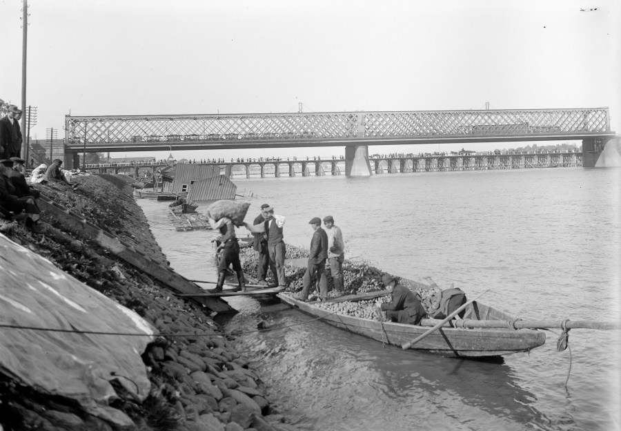 Galary dowożące produkty rolnicze do Warszawy. W głębi most Kierbedzia oraz most Beselera. Fotografował Henryk Poddębski. Zdjęcie w zbiorach Muzeum Warszawy