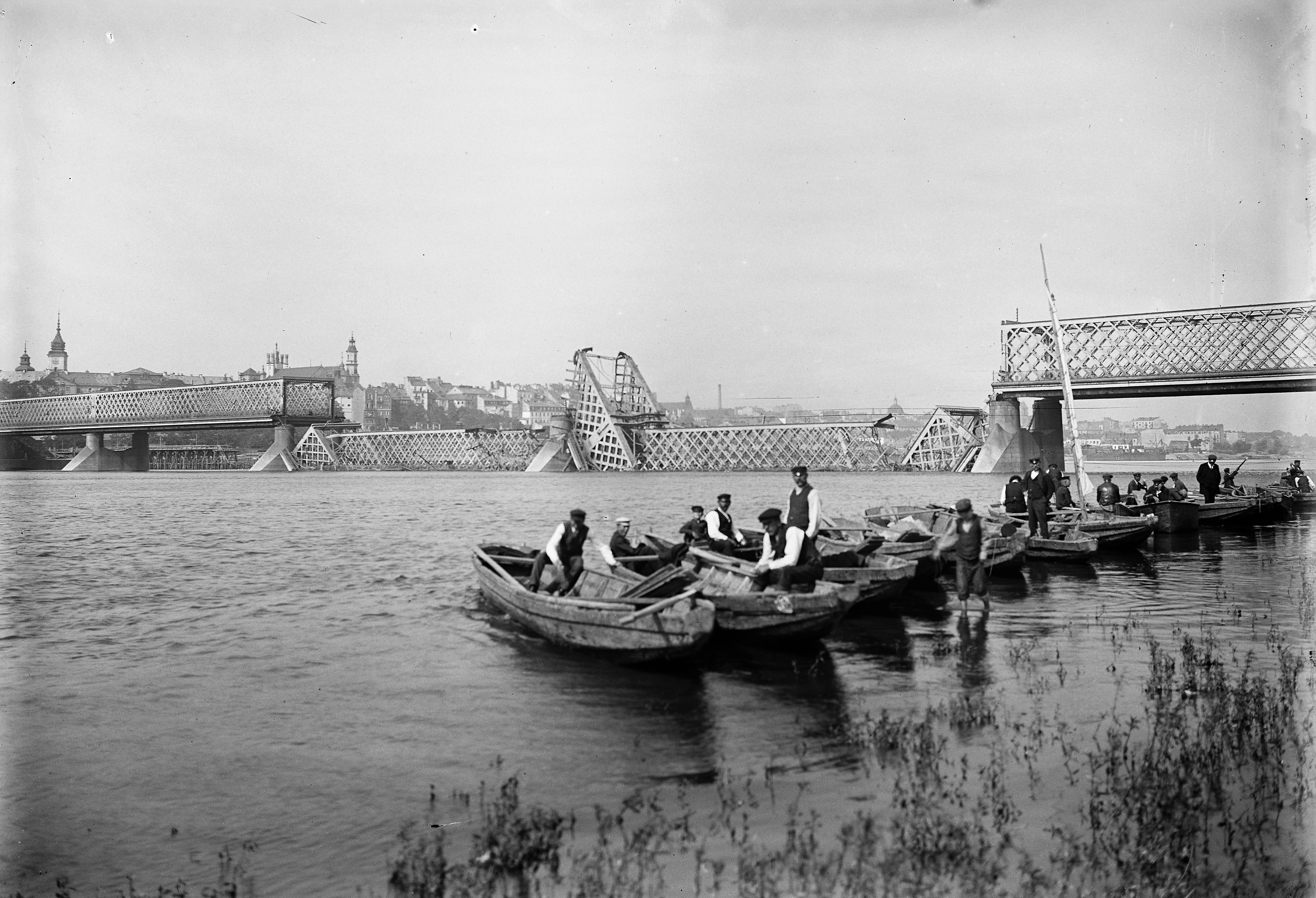 Przewoźnicy przez Wisłę przed wyruszeniem do pracy. W głębi widoczny zniszczony most Kierbedzia. Zdjęcie w zbiorach Muzeum Warszawy Fotografował Henryk Poddębski.