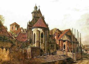 Ale, ale! Co my tu mamy za kościół po lewej stronie traktu, skoro teraz przy placu Zamkowym go nie mamy? Otóż jest to kościół pod wezwaniem świętej Klary widziany od strony absydy, a wzniesiony przy klasztorze Bernardynek.