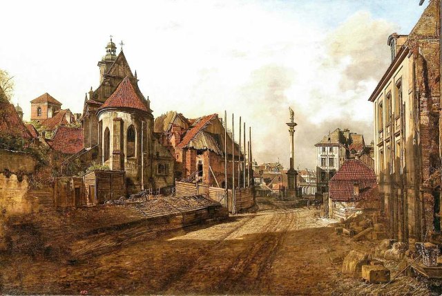 Kolumnę Zygmunta III zapewne rozpoznaliście Państwo bez większego wysiłku, a czy zwróciliście uwagę, że jest pomalowano na złoty kolor, podobnie jak figura pierwszego Wazy na polskim tronie? Tak, w przeszłości kolumna i król „zrobieni” byli na złoto! Za kolumną widoczna Brama Krakowska, jedna z dwóch głównych bram prowadzących do Starej Warszawy, w czasie, gdy powstawał obraz zamieniona już w kamienicą czynszową. Brama została rozebrana w roku 1818 wraz z innymi zabudowaniami po zachodniej stronie Zamku Królewskiego, gdy tworzono plac Zamkowy.