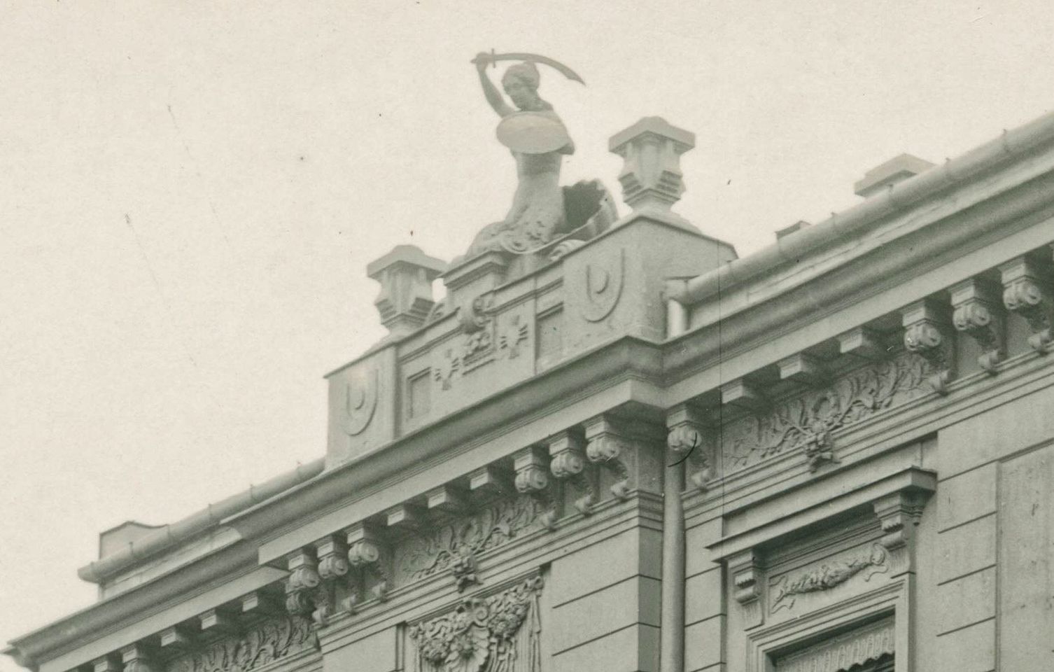 Syrenka Konstantego Hegla jako zwieńczenie fasady frontowej domu przy ulicy Lipowej 6, należącego do Inspekcji Wodociągów i Kanalizacji. Lata dwudzieste XX wieku. Zdjęcie w zbiorach Muzeum Warszawy.