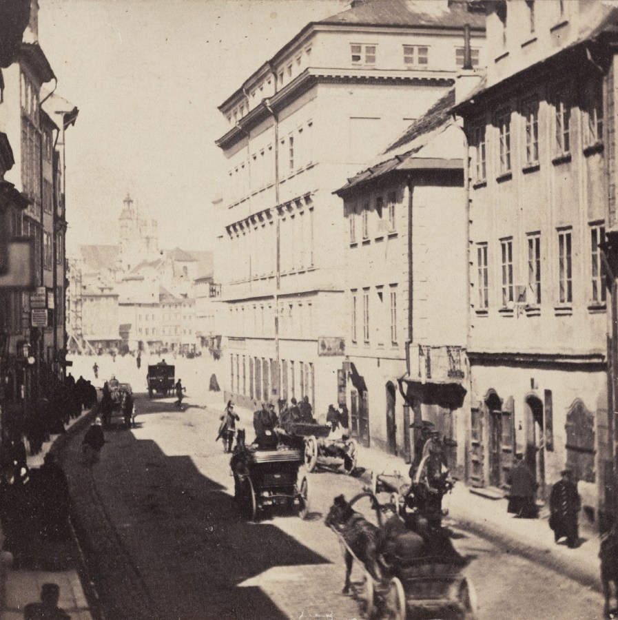 Rok 1861. Spojrzenie z balkonu kamienicy Kestnera (tej z „Telimeną”) w kierunku placu Zamkowego. Kamienice po prawej stronie zostaną wyburzone.